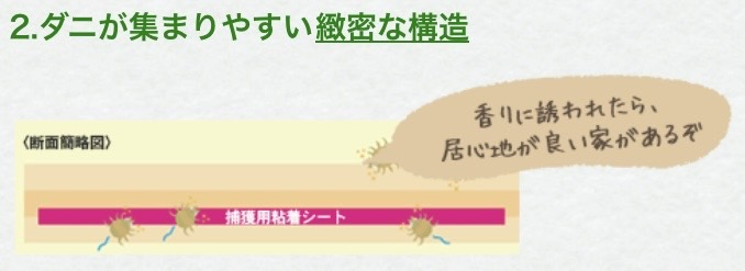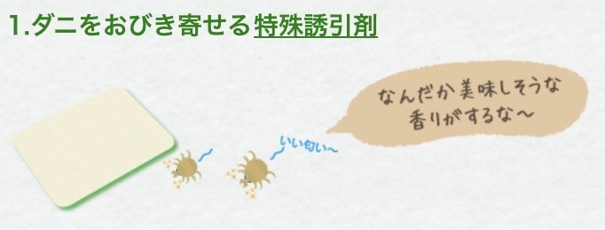 ダニ取りシートの仕組みは、ダニが好む香り(誘引剤)でシートへおびき寄せて、粘着剤や乾燥技術で捕獲します。