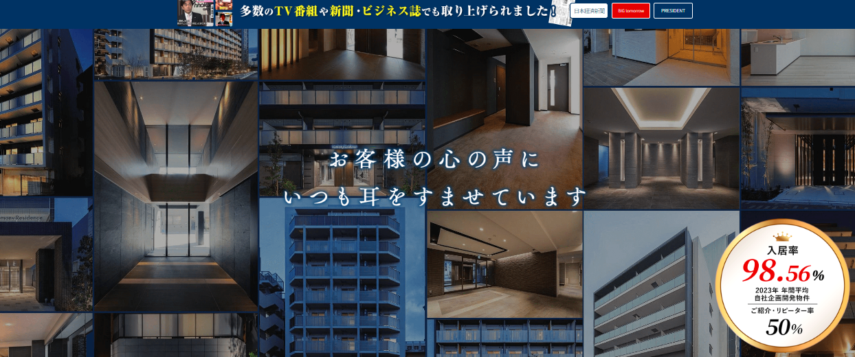 不動産投資売上No.1の実績を持ち、東京23区・関西エリア中心に新築・中古マンション、アパートを幅広く取り扱う。